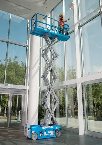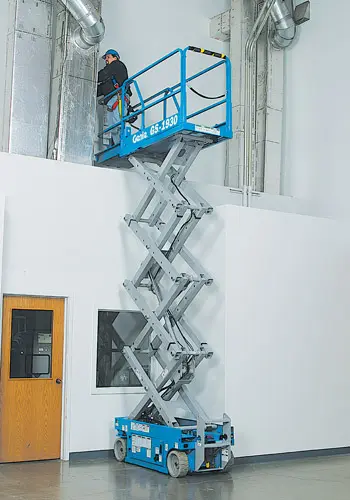 The Genie scissor lift 1930 delivers a quiet, convenient method for operation in sound sensitive environments like office buildings, shopping malls, hotels, schools and more. This GS-1930 fits into spaces as narrow as 32 inches wide making it extremely versatile.