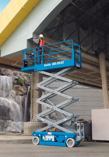 The Genie GS 2632 scissor lifts deliver a quiet, convenient method for operation in sound sensitive environments like office buildings, shopping malls, hotels, schools and more, providing an adaptable approach to all jobs. Compact and maneuverable, the Genie 2632 will fit into spaces as narrow as 32 inches wide. Contact CanLift to lease or buy the Genie GS 2632 scissor lift.