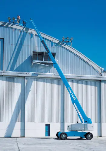 The Genie S-105 4×4 boom lift has a working height of 111 feet or almost 40 meters. The Genie 105 includes standard features like 4 wheel drive and all wheel brakes. Extendable axles are operated from an 8 foot (2.4 meter) durable steel rotating platform with fully proportional platform controls. The Genie S-105 (4X4) boom lift provides lifting versatility with a combination of up, out, and over positioning capabilities in addition to extensive outreach.