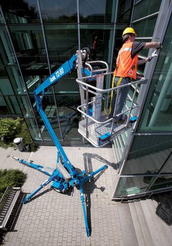 If you are looking for a boom lift that’s portable, yet flexible enough to reach the most demanding of locations, then look no further, the Genie TZ-50 Towable Boom Lift will more than suit your needs. As a compact unit, the Genie TZ-50 can easily be hitched to the back of an SUV or a pick-up truck and maneuvered into position, allowing for a level of portability that is unparalleled in a standard boom lift. Lightweight in design, and appropriate for both indoor and outdoor worksites, the Genie TZ-50 can be used on a wide variety of surfaces from concrete to gymnasium floors and even on lawns.
