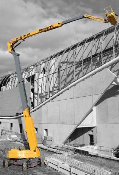 Lease or buy the Haulotte HA 130 JRT from CanLift Equipment. This articulating boom lift has rough-terrain tires and a clearance of 15 inches, making it a good heavy-duty lift. It can reach heights of over 58 feet and a horizontal reach of 65 feet.