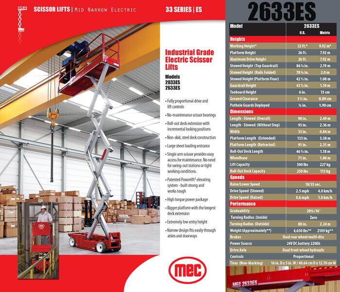 The MEC 2633-ES scissor lift is a rugged machine that can lift up to 500 lbs to heights of 32 feet. It has fully proportional drive and lift controls, roll-out deck extension and a narrow design fits easily through aisles and doorways.